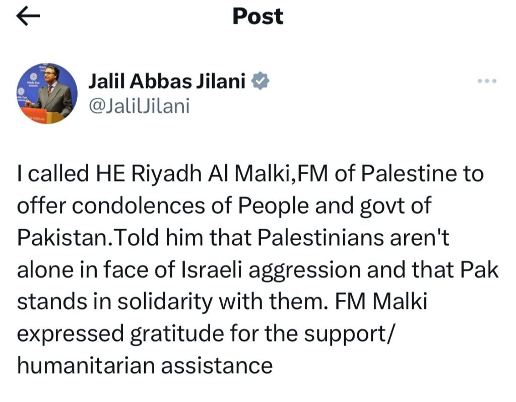 پاکستان کے نگران وزیر خارجہ جلیل عباس جیلانی نے فلسطینی وزیر خارجہ ریاض المالکی سے ٹیلی فونک رابطہ کیا اور پاکستان کی عوام اور حکومت کی جانب سے تعزیت کا اظہار کیا ۔ نگران وزیر خارجہ جلیل عباس جیلانی نے فلسطینی وزیرخارجہ سے اظہار یکجہتی کرتے ہوئے کہا ہے کہ ہم فلسطین کے عوام کے ساتھ ہیں ، اور اسرائیلی بربریت کی بھرپور مذمت کرتے ہیں ، فلسطینی وزیر خارجہ نے امداد بھجوانے پر پاکستان کا شکریہ ادا کیا