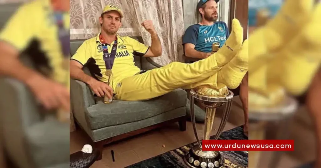 19 نومبر کو احمد آباد میں آسٹریلیا نے ورلڈ کپ کے فائنل میں بھارت کو شکست دے کر چھٹی بار ٹائٹل اپنے نام کیا جس کے بعد آسٹریلوی ٹیم کے آل راؤنڈر مچل مارش کی ایک تصویر سوشل میڈیا پر وائرل ہوئی جس میں انہیں ورلڈ کپ ٹرافی پر پاؤں رکھے ہوئے دیکھا گیا تھا۔
