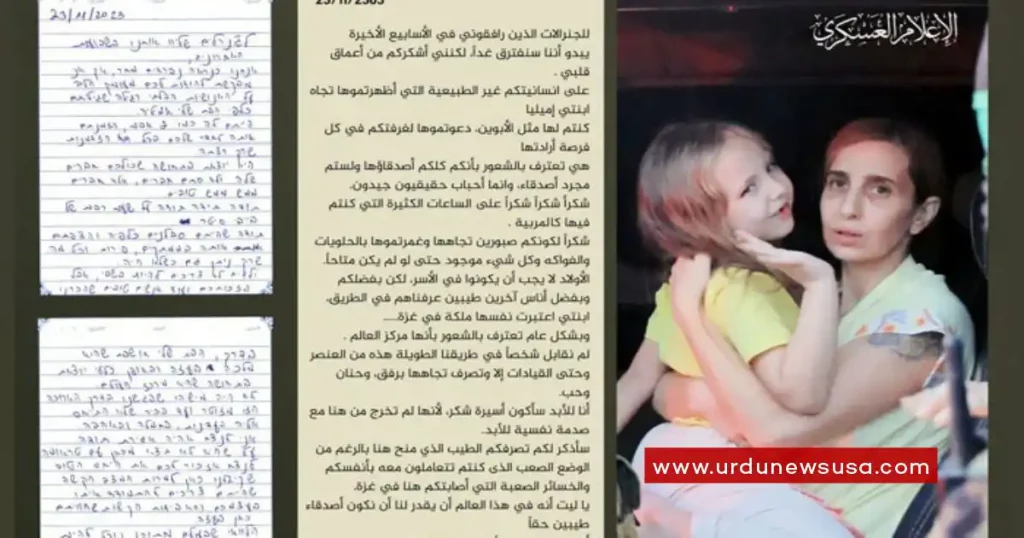 تل ابیب: غزہ میں مشکل حالات اور نقصان کے باوجود ہم سے برتے جانے والے آپ کے حسن سلوک کا میں سب کو بتاؤں گی، حماس کے عسکری ونگ القسام بریگیڈز کی جانب سے رہا کی گئی اسرائیلی خاتون دنیال اور ان کی ننھی بیٹی ایمیلیا کا خط سامنے آگیا۔